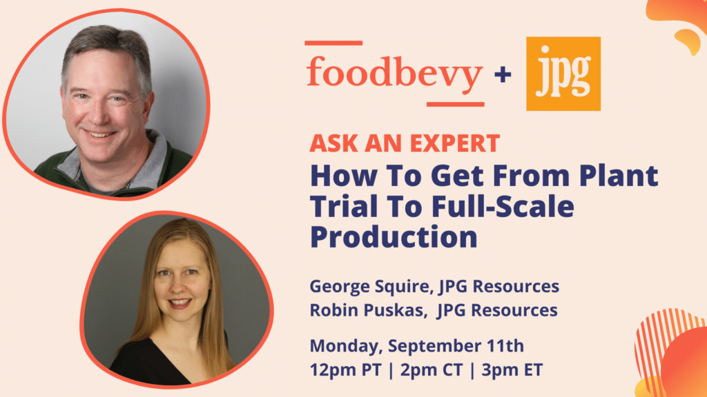 Do you have questions on taking your product from home kitchen and small scale to plant trials and full-scale production? I’ve invited in the team at JPG Resources to answer your questions on product commercialization. They’ll answer your questions on: