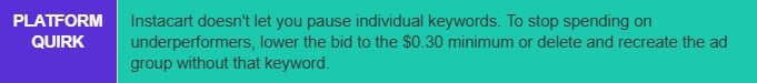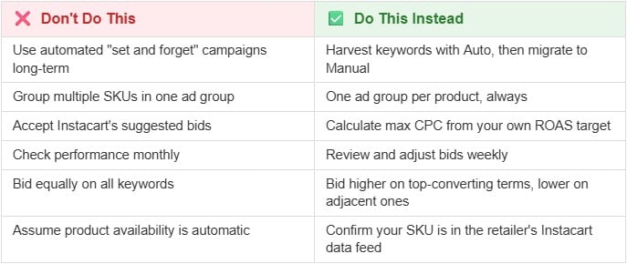 Once you have individual ad groups per SKU, you need to set bids at the individual keyword level. Not all keywords perform equally and Instacart’s suggested bids are not calibrated to your ROAS goals.