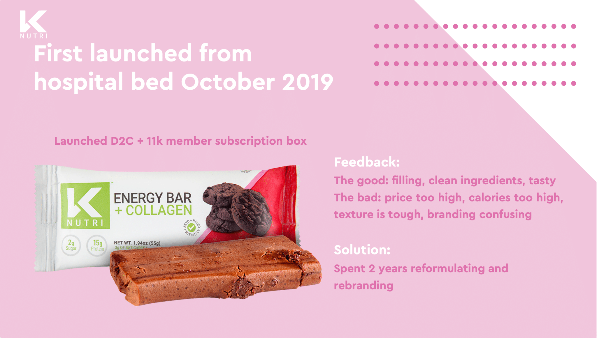 We were lucky to partner with KetoKrate during our launch and 11,000 unique customers got the chance to try our new product. Over 1,000 people left feedback during a post-purchase survey and KetoKrate was kind enough to send us the results. This was critical in us re-evaluating every aspect of the bar. The most important changes were removing the word “Energy” which customers associated with caffeine, making the bar softer in texture, and reducing the number of calories.