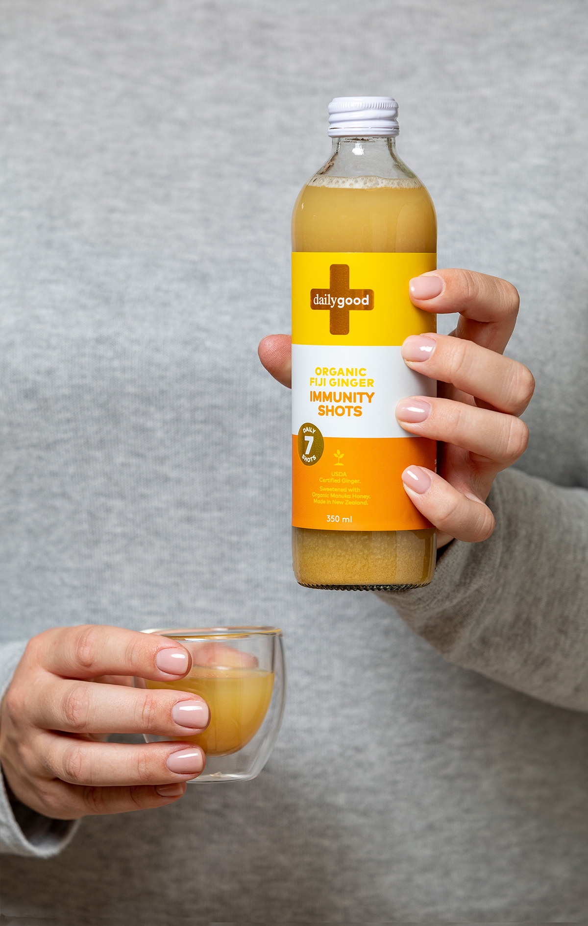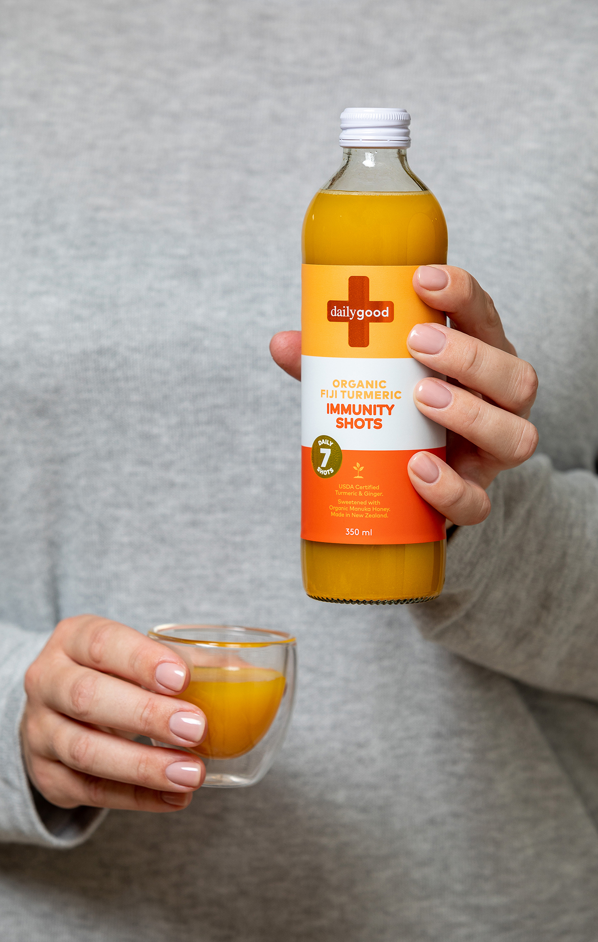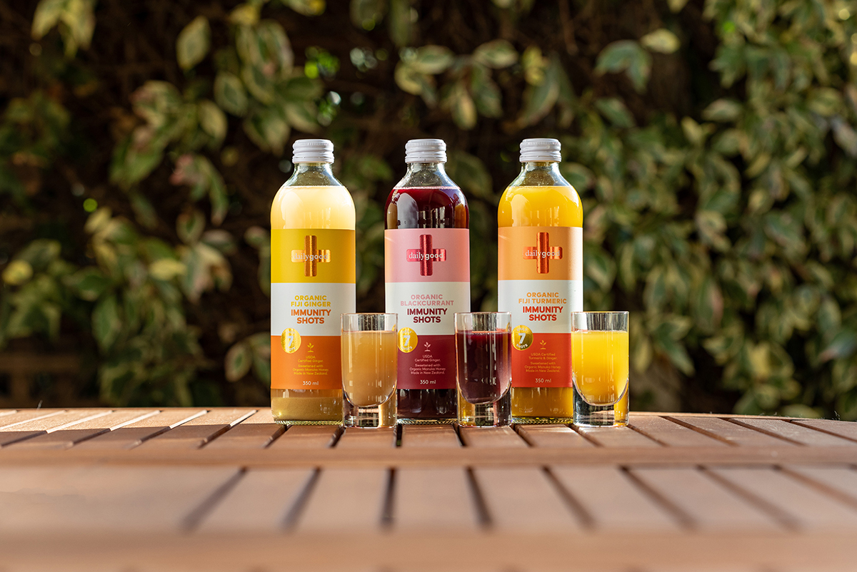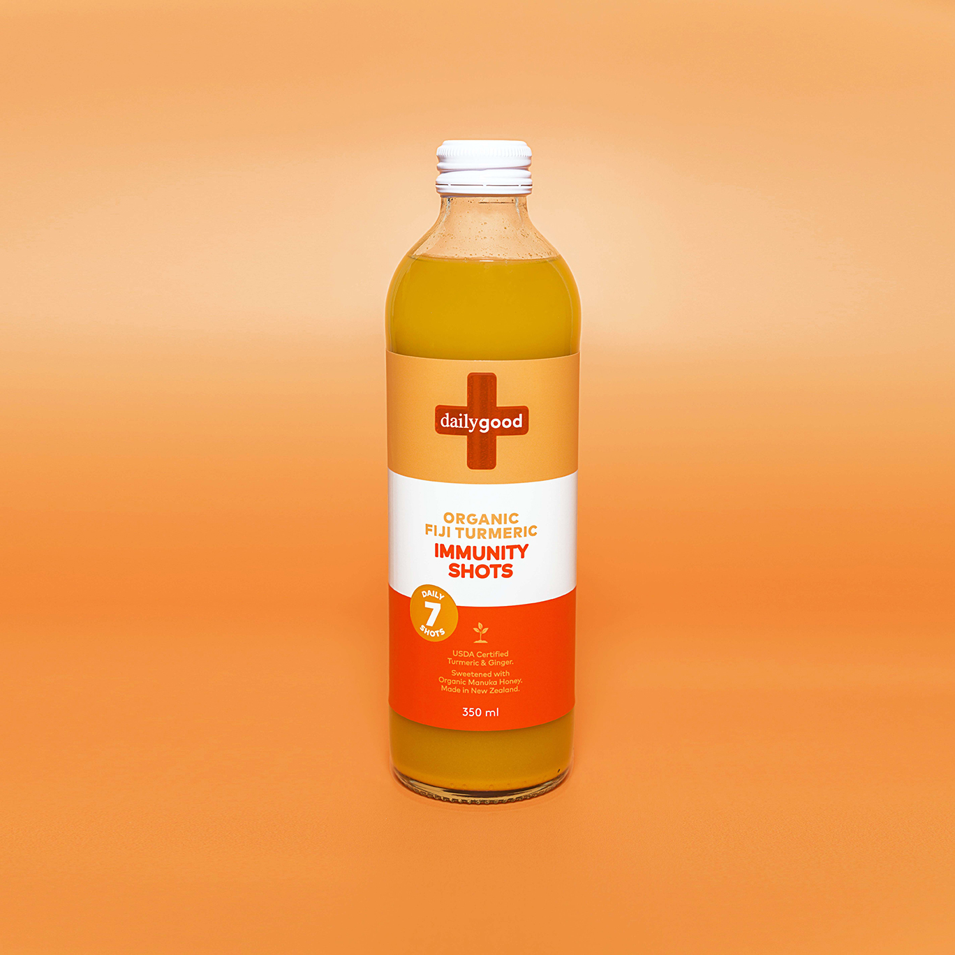 Daily Good immunity shots are formulated with natural and organic ingredients to boost your immunity supported by zinc and NZ mānuka honey. A natural immunity booster packed with natural and organic ingredients supported by zinc and NZ mānuka honey, providing a fully rounded health boost with turmeric to decrease inflammation and ginger to aid digestion. Each bottle includes 7 daily shots that can be taken neat or enjoyed diluted, in hot or cold water. Proudly made in New Zealand from local ingredients, plus USDA-certified organic turmeric and ginger sourced from Daily Good’s partner farm in Fiji, where the origins of the ingredients can be traced back to the very field that they were planted in. Gluten-free, dairy-free, organic and no added fillers or nasties. Supplemented food.