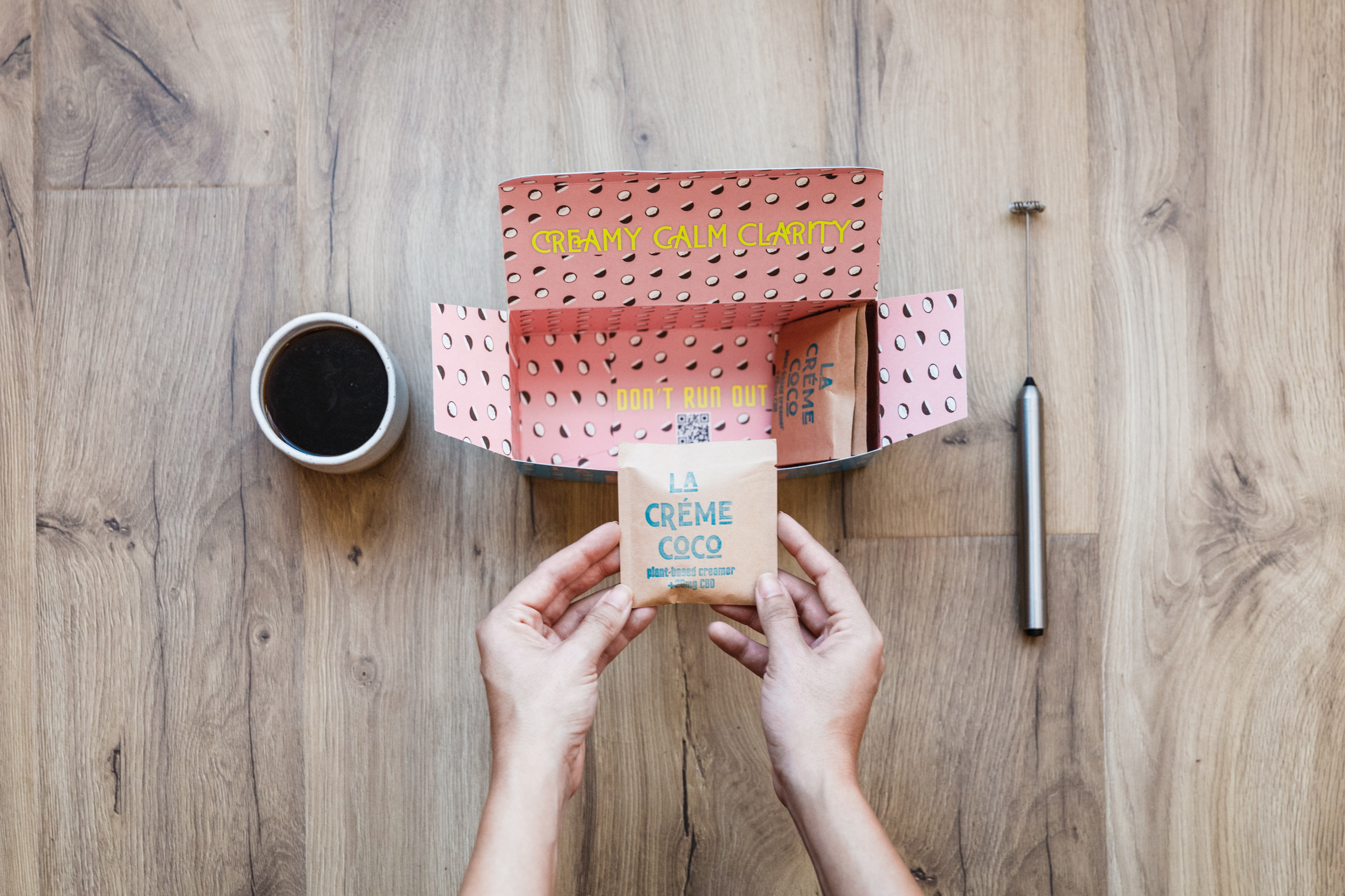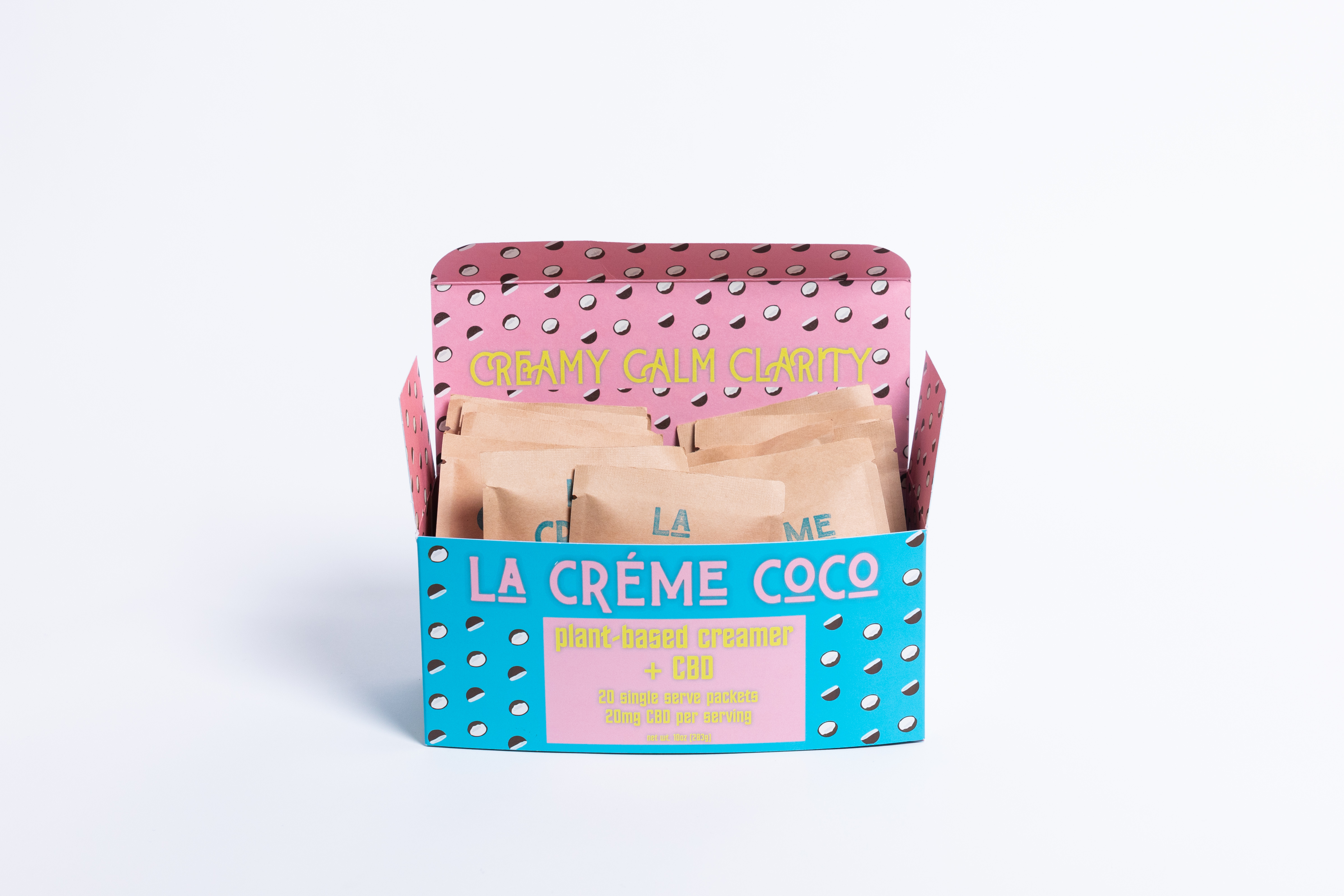 We recently launched an organic plant-based creamer with hemp-derived CBD, La Crème Coco, packaged in single serve biodegradable packets.