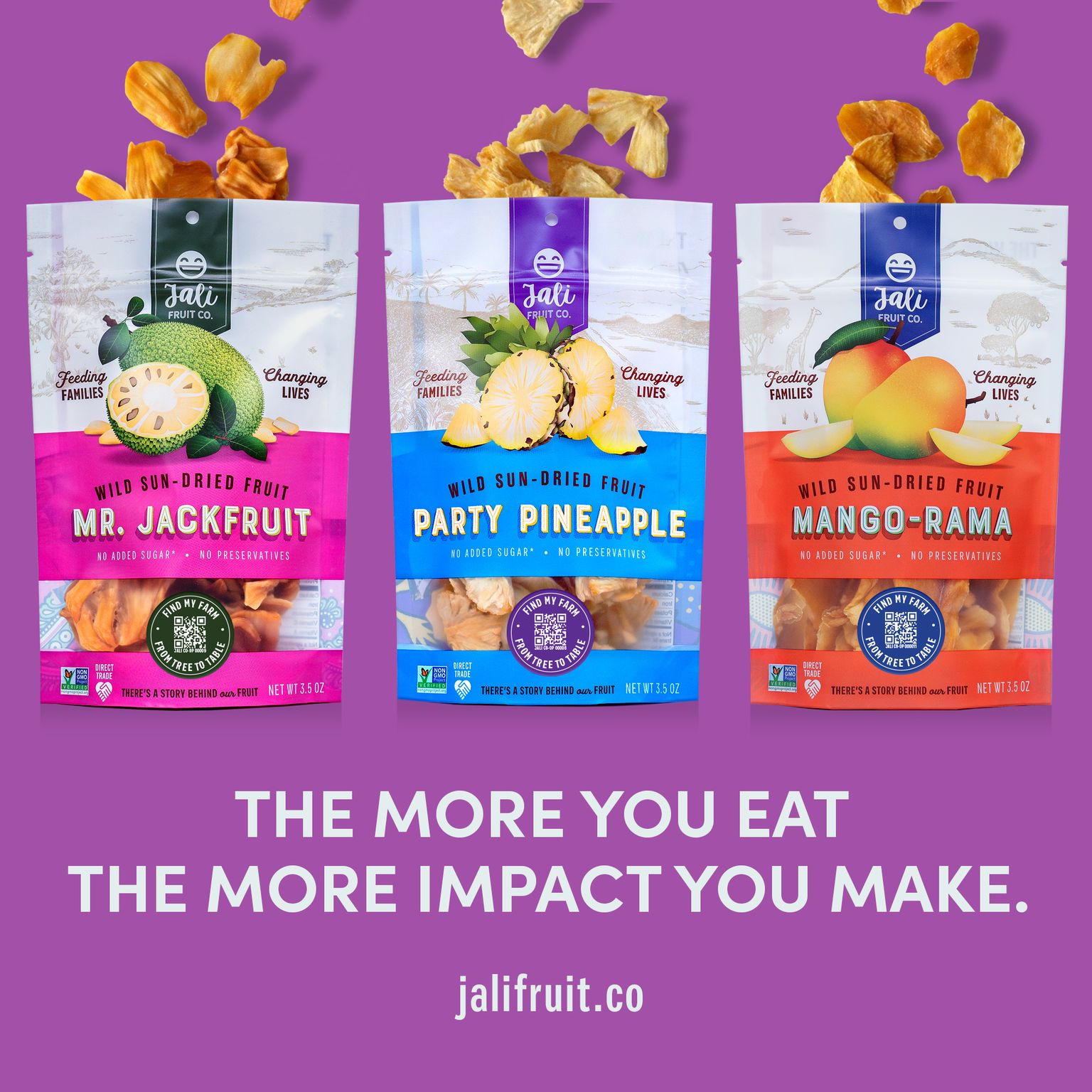 Jali Fruit Co. helps transform food waste into opportunity by working with rural women farmers in Sub-Saharan Africa and the Caribbean. We upcycle what would’ve been food waste and turn it into an all-natural dried fruit snack item. For every 6 bags, we’re saving 3 pounds of fruit and improving 1 woman’s livelihood. Consumers are able to trace their impact by scanning the QR code that’s hand-labeled on each individual bag of fruit. It’s an interactive experience that allows the consumers to learn about where their fruit is coming from and who made it happen.