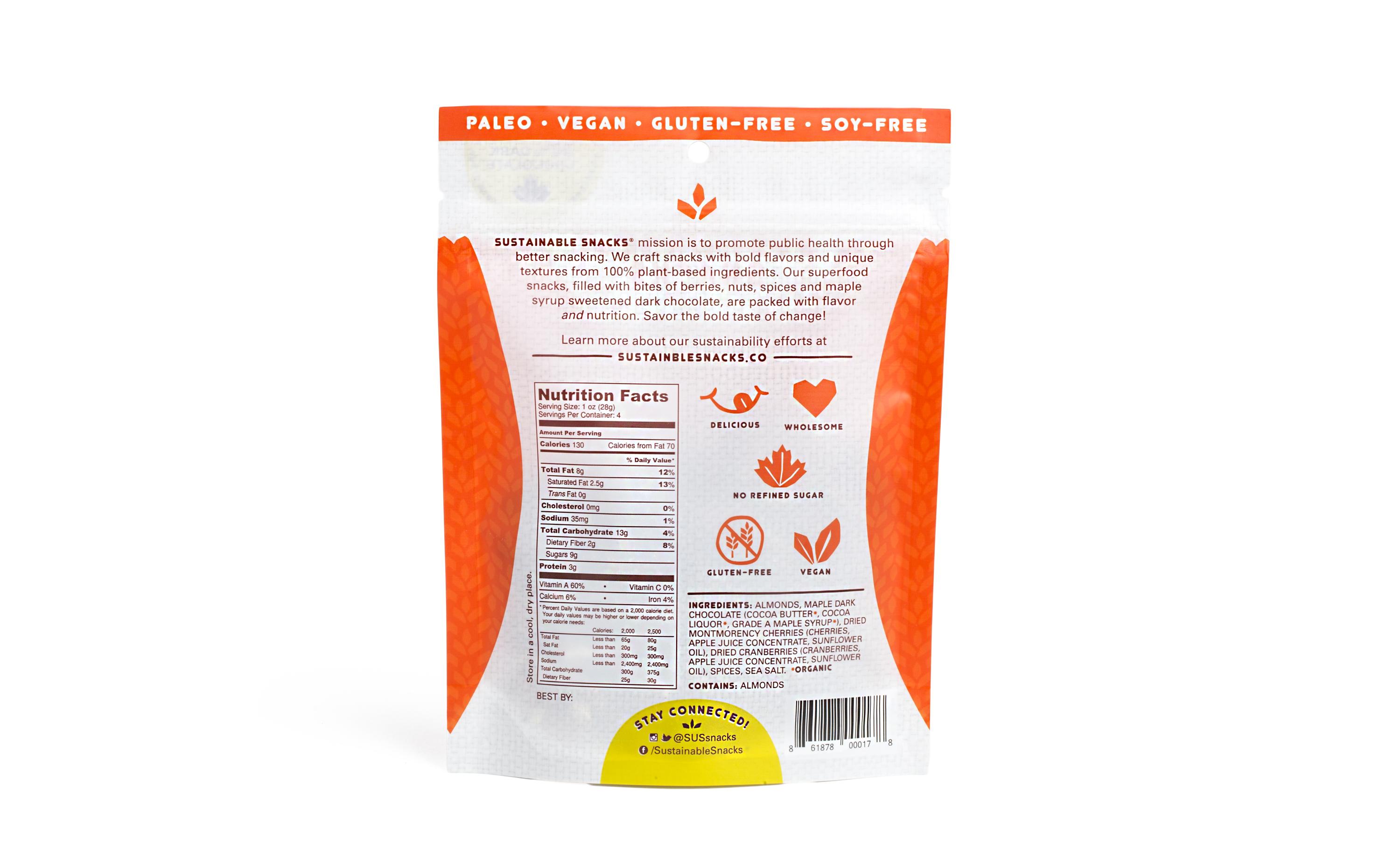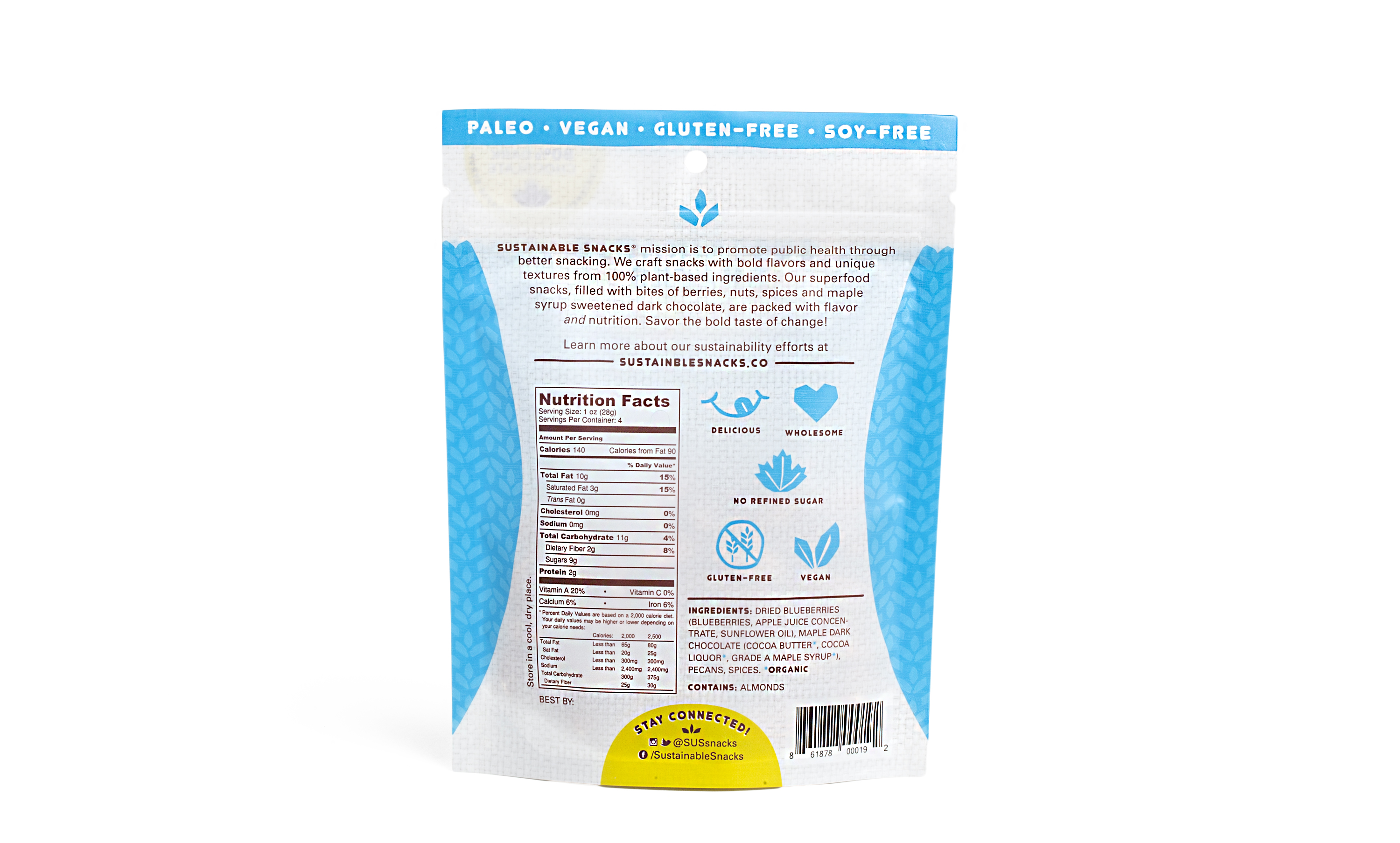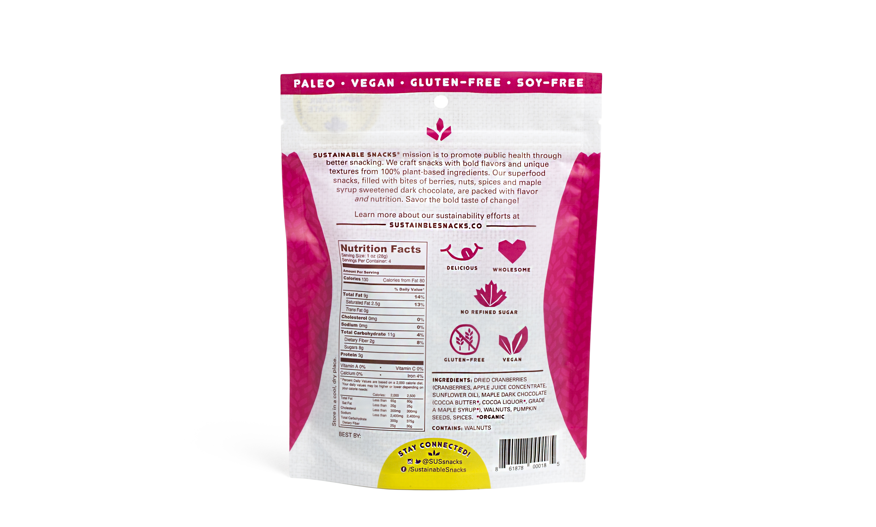 Sustainable Snacks is on a mission to promote public health through better snacking. We craft snacks with bold flavors and unique textures from 100% plant-based ingredients. Our flagship line of Superfood Snacks, bites of berries, nuts, spices and maple syrup infused dark chocolate, are packed with flavor and nutrition!