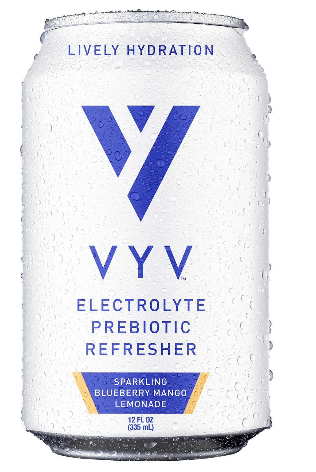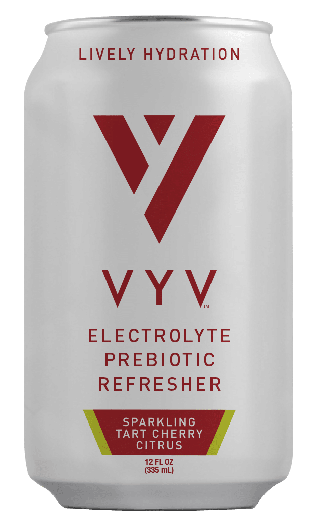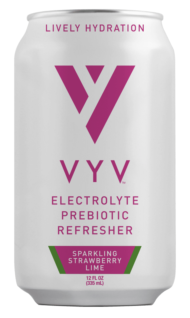 VYV is a sparkling prebiotic electrolyte drink made with real fruit juice, 5g prebiotic fiber, and 455mg electrolytes. Zero added sugar, 30 calories per can. Three flavors: Strawberry Lime, Blueberry Mango Lemonade, and Tart Cherry Citrus.