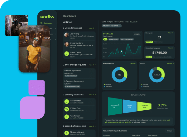 Restocking can increase content frequency, link usage, organic product integration, and retention of high performers. Limit restocks to your top 10–20 percent. Often, product reinforcement is more cost-efficient than increasing commission. Endlss’s gifting tools make scheduling and tracking restocks straightforward at any scale.