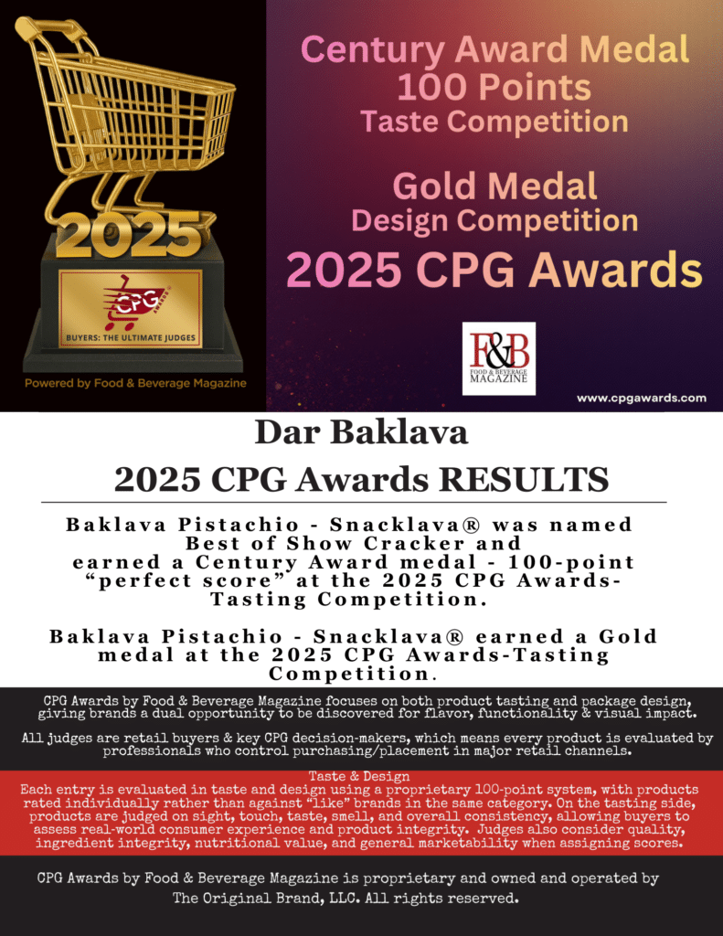 The brand’s Pistachio Baklava and Sesame Crackers with Pistachio took home Century, Double Gold, and Gold honors from Food & Beverage Magazine. Judged by a panel of retail buyers actively scouting new products, the awards underscore Dar Baklava’s standout quality and position the brand for increased retail interest.