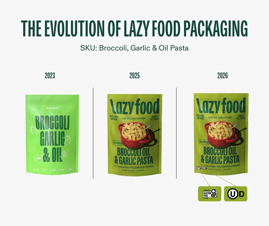 The redesign includes a new front and center pasta image, a larger logo, gluten-free certification, and new kosher status updates aimed at boosting shelf visibility and meeting evolving consumer needs. Originally designed for DTC, Lazy Food’s packaging now reflects its focus on driving retail velocity, with Kapoor noting that intentional iteration is part of the rand-building process.