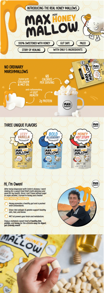 Max Sweets, founded by Shari Leidich, has launched their gut-friendly, collagen-infused Max Honey Mallows online and at select Walmart locations. Created by Shari’s daughter during her battle with Crohn’s disease, Max Honey Mallows are made with wildflower honey, bovine collagen, and MCT oil for a guilt-free sweet treat that supports gut and brain health. The marshmallows are now available for shipping via Walmart.com, offering a low-sugar, functional alternative for health-conscious snackers.